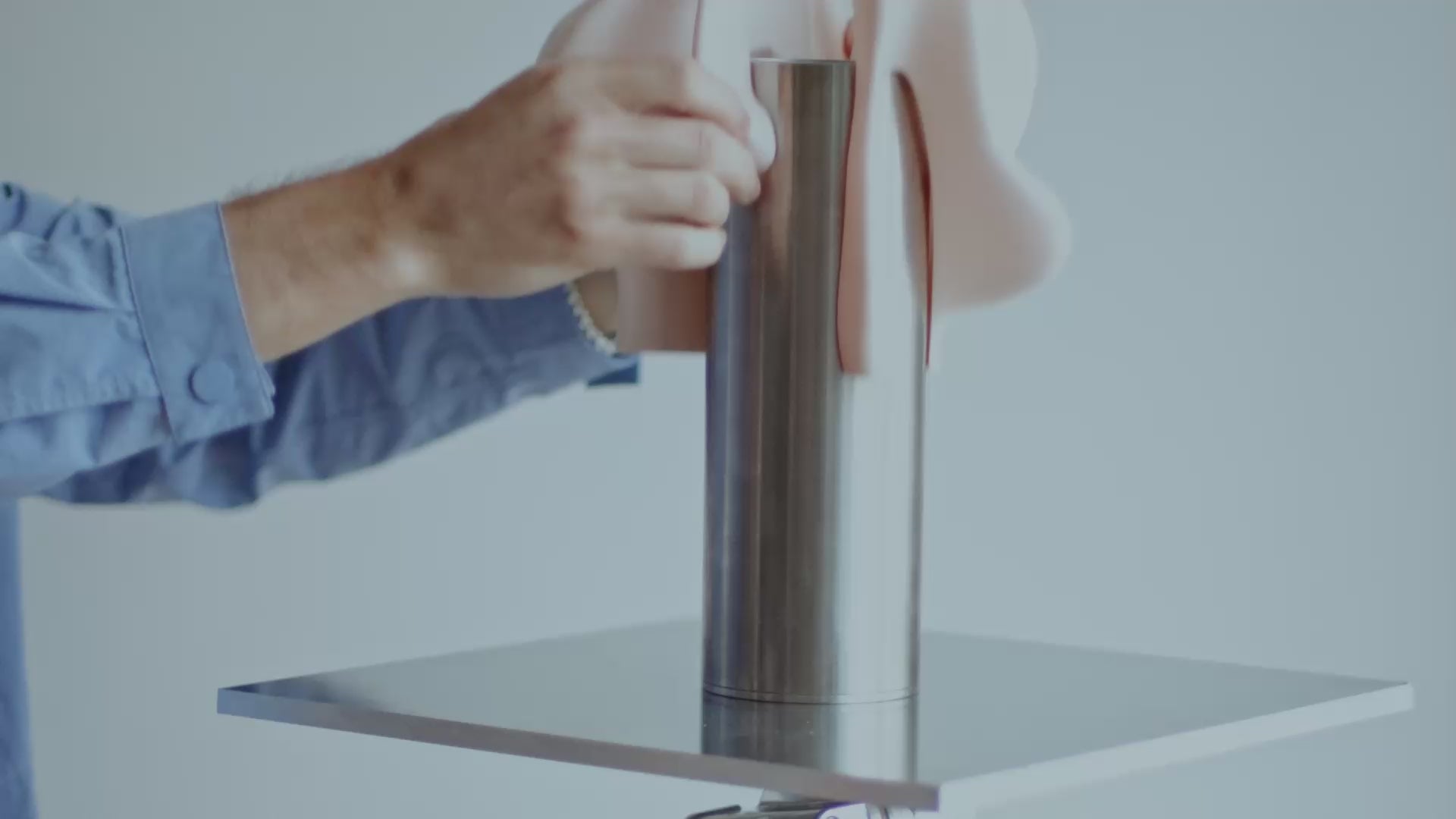 A solid stainless-steel core anchors the piece. Around it, a fluid shell unfolds, almost as if it has grown naturally around the steel cylinder rather than being sculpted.